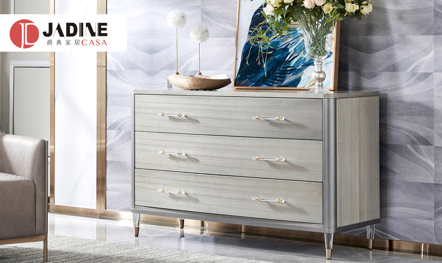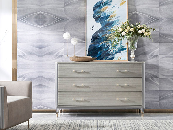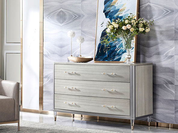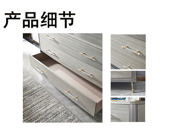 使用亚克力拉手、亚克力脚、不锈钢拉手及不锈钢脚套、搭配自闭式静音滑轨,更有甚者采用进口岩板台面作为搭配,迎合现代人群的消费观,多种不同种类材料复合搭配,营造现代舒适实用的家具质感。
