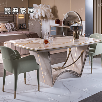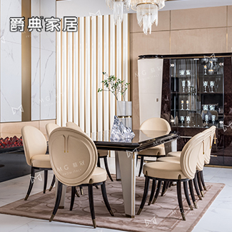 慕冠当代轻奢实木不锈钢描边长餐桌椅组合