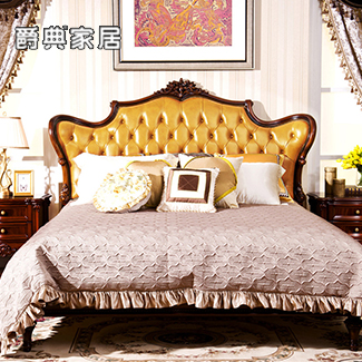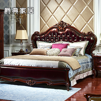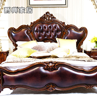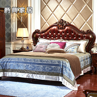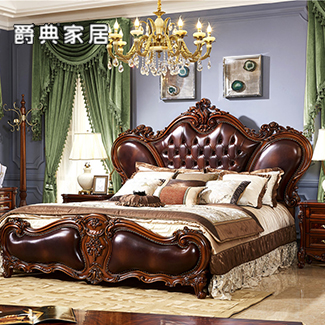 奢艺绘欧式头层牛皮高雅实木雕花大床