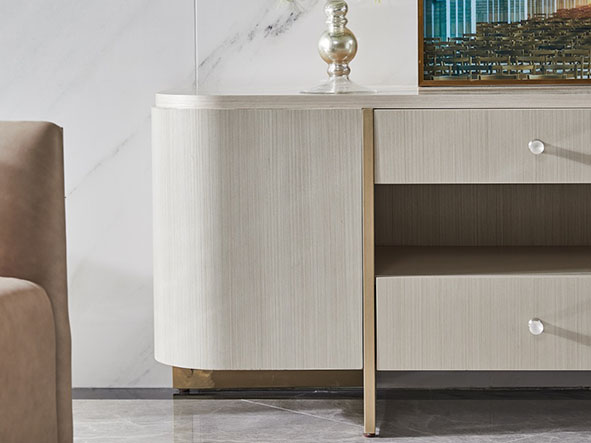 使用亚克力拉手、亚克力脚、不锈钢拉手及不锈钢脚套、搭配自闭式静音滑轨,更有甚者采用进口岩板台面作为搭配,迎合现代人群的消费观,多种不同种类材料复合搭配,营造现代舒适实用的家具质感。